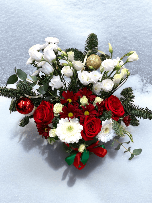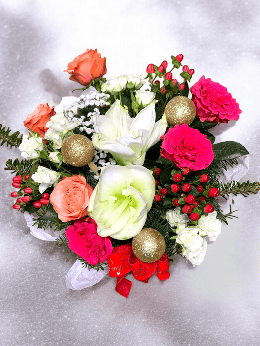 Aranjament festiv de Crăciun cu Amarilis, Trandafiri și Globuri Strălucitoare