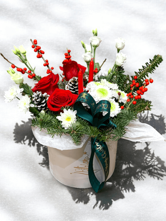 Aranjament Elegant de Sărbători cu Ilex, Trandafiri și Lumânări Festive