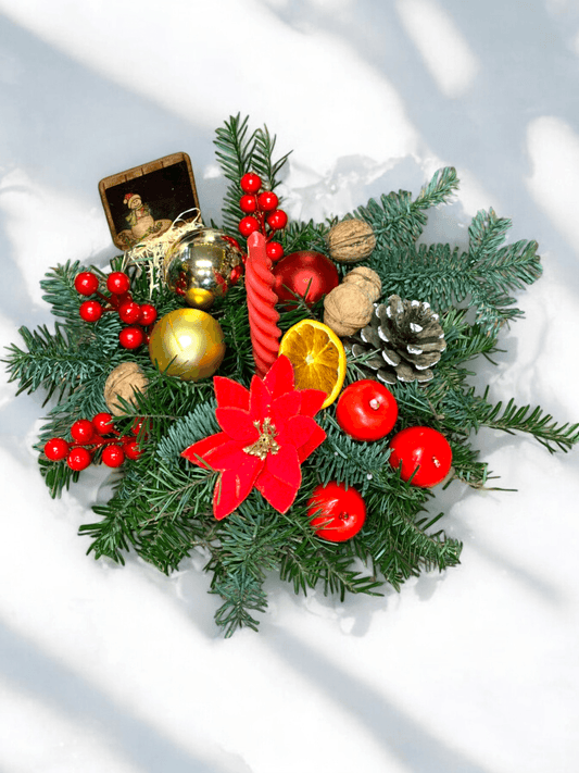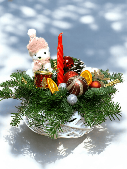 Aranjament de Iarnă cu Globuri, Lumânare, Portocale și Ursuleț de Poveste
