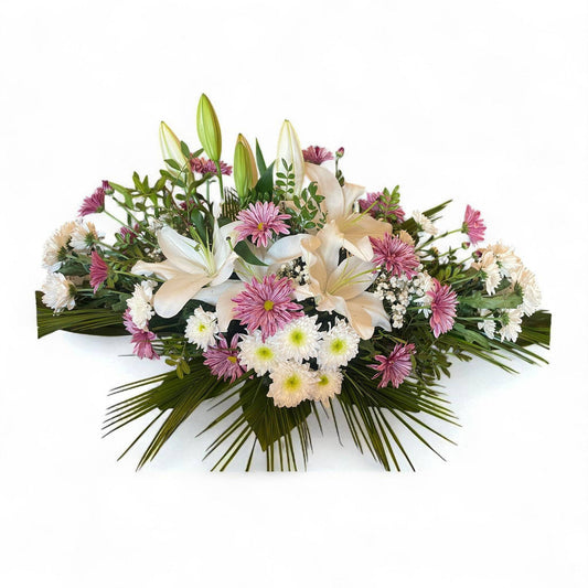 Aranjament funerar cu crini albi, crizanteme, gypsophila și trandafiri