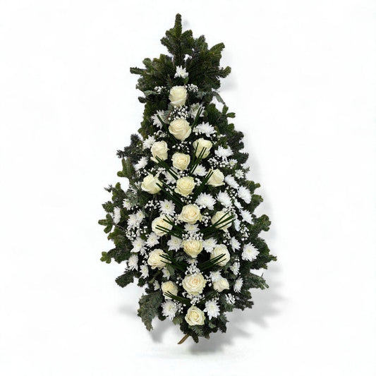 Coroană funerară cu crizanteme și trandafiri – respect și eleganță pentru funeralii
