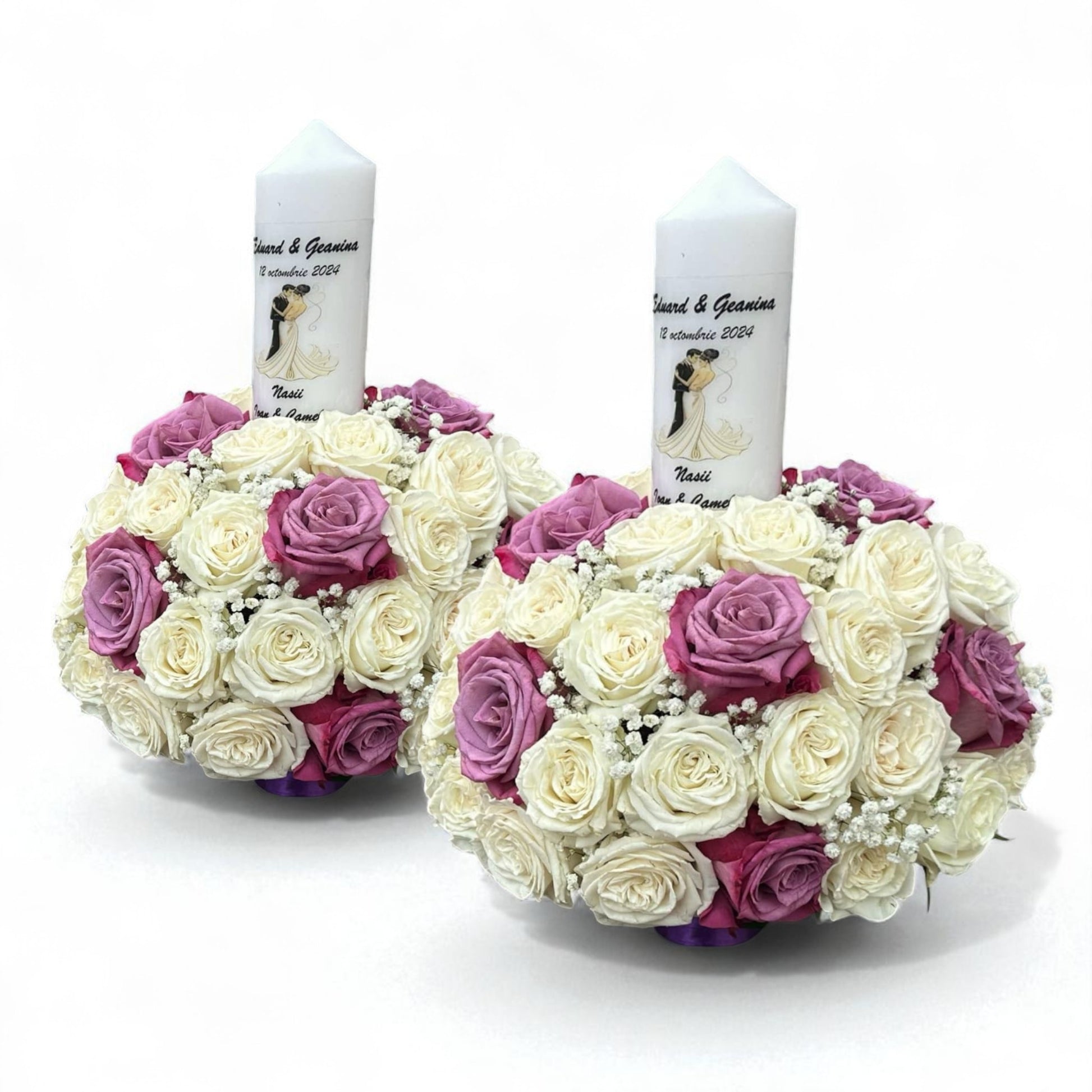 Set lumanari cununie cu trandafiri albi și mov 40cm