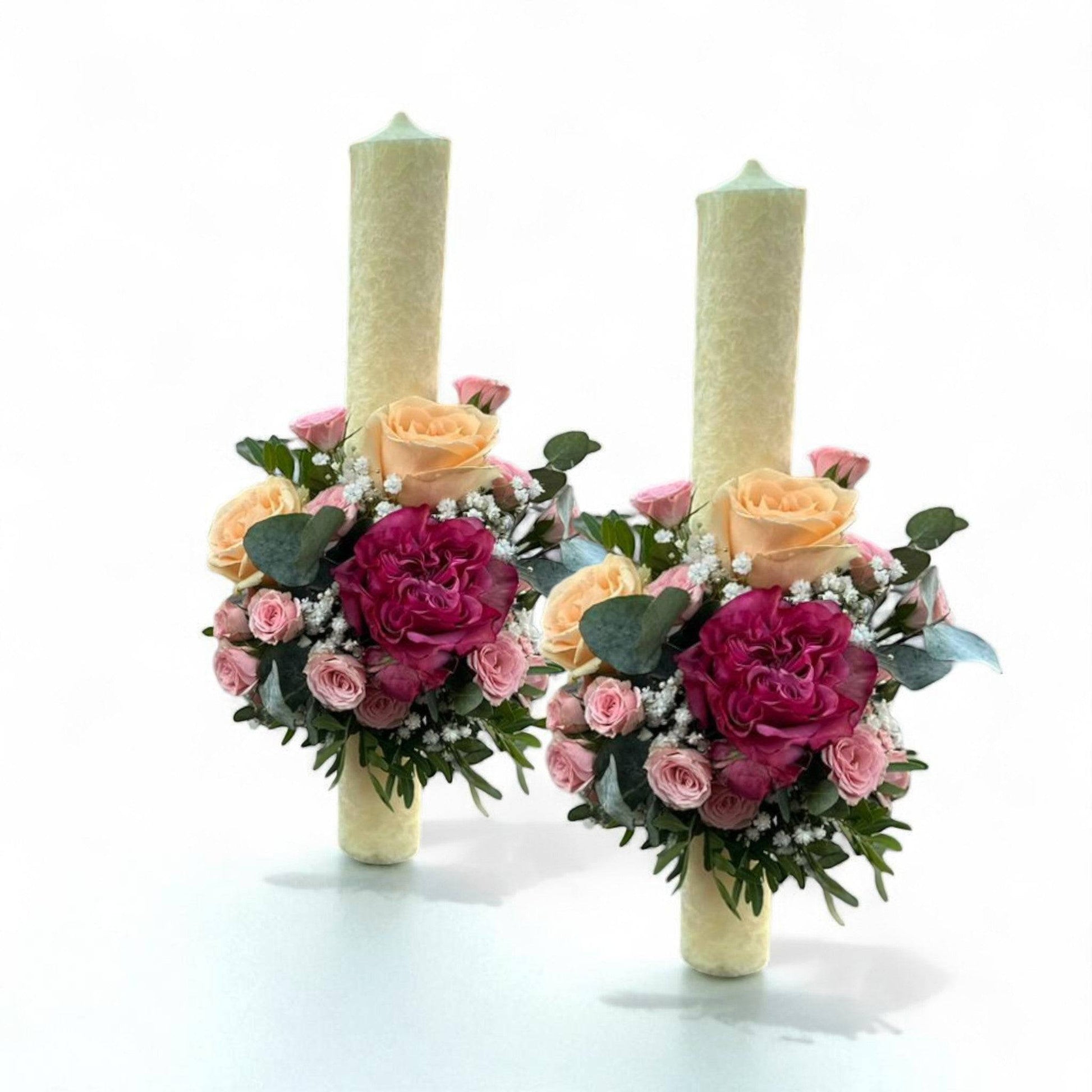 Un set de lumânări de cununie spectaculos, decorat cu trandafiri mov și portocalii, miniroze roz, gypsophila delicată și accente verzi de eucalipt. 🌿💜🧡💗