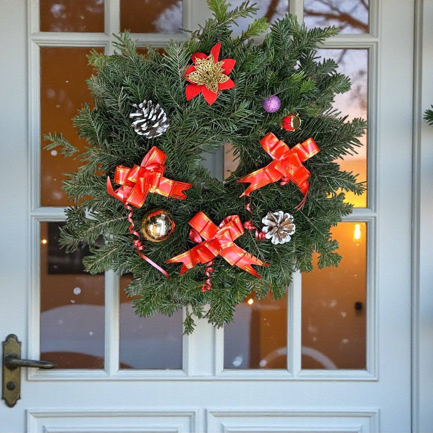 O coroniță festivă și elegantă, ideală pentru a aduce spiritul Crăciunului în casă sau birou. Accentele roșii, verzi și aurii creează o atmosferă caldă și festivă.